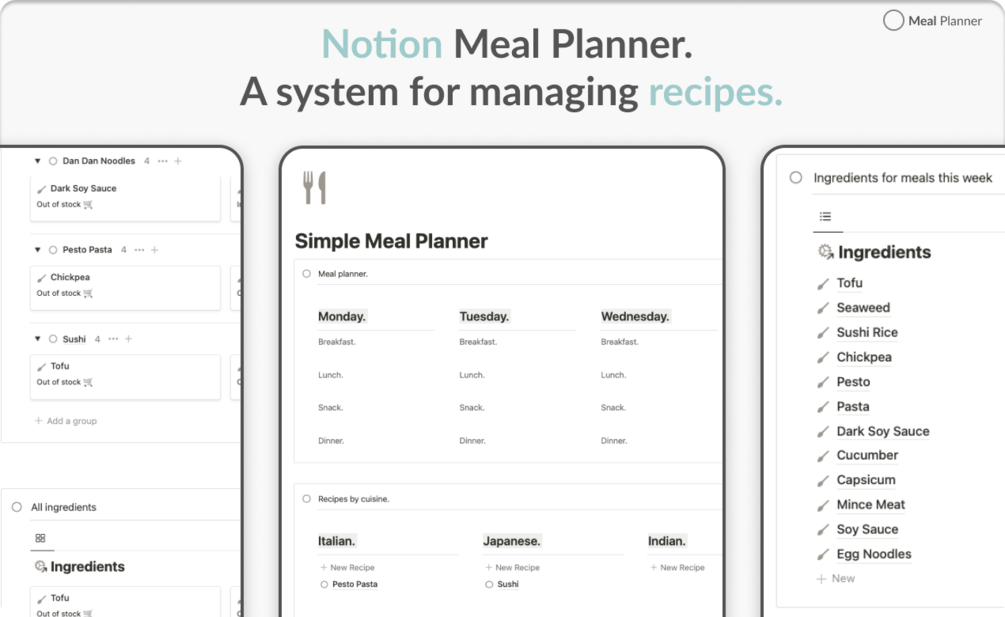 A Notion meal planner to Plan meals, automate your shopping list and track your ingredients.